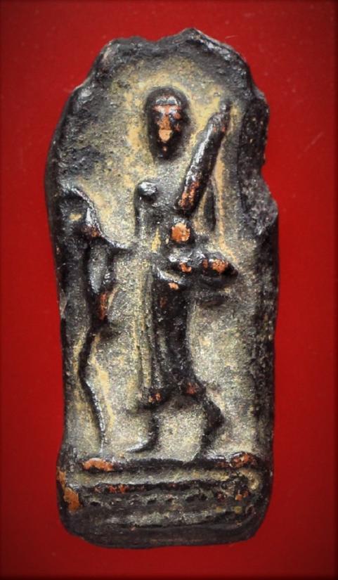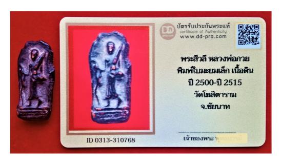 พระสีวลี หลวงพ่อกวย พิมพ์ใบมะยมเล็ก เนื้อดิน ปี 2500-ปี 2515 วัดโฆสิตาราม + บัตรรับรอง |