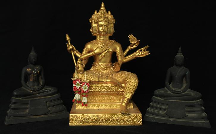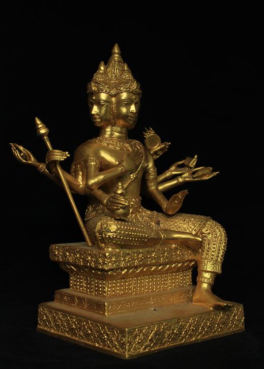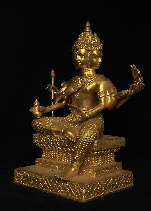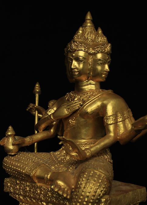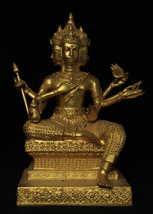 พระพรหมหรือท้าวมหาพรหมองค์นี้มาแบบใหญ่อลังการดีครับ องค์พระหล่อด้วยเนื้อทองผสมแล้วจึงนำมาปิดทองคำเปลว(ทองแท้)ที่ตัวองค์ และพระองค์นี้น่าจะไม่ใช้งานใหม่ๆทั่วๆไป พระน่าจะมีอายุพอสมควรเพราะดูได้จากกรรมวิธีในการหล่อ เนื้อโลหะ(ด้านใน)และความคมของงานปั้นแบบแล้วนำมาปิดทอง