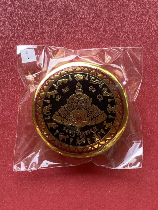 เคาะเดียวแดง สีผึ้งพระราหู รุ่น มงคลจักรวาล เนื้อ โลหะชุบทองลงยาสีดำขอบสีแดง ขนาด5ซม |