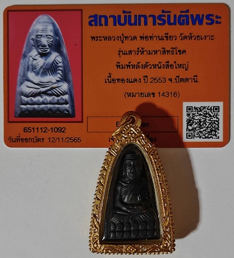 พระหลวงปู่ทวด พ่อท่านเขียว วัดห้วยเงาะ พิมพ์หลังตัวหนังสือใหญ่ รุ่นเสาร์ 5 มหาสิทธิโชค ปี 2553 เลี่ยมกรอบทองไมครอน ไม่เคยผ่านการใช้งาน |