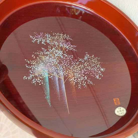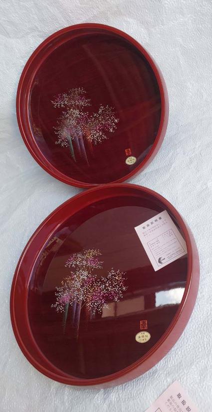 ***วัดใจ***ถาดไม้เคลือบเงา (Wajima-nuri lacquerware) งานศิลปะโรยผงทอง ถาดเคลือบแล็กเกอร์รุ่นพิเศษ 2ใบ 2ขนาด สภาพใหม่เก่าเก็บ เป้นถาดบุชา