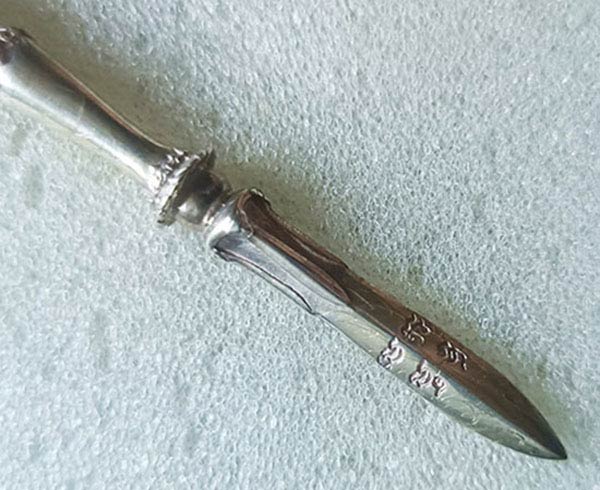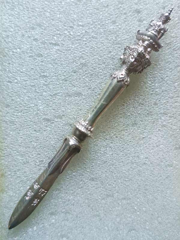 พระขรรค์จักรพรรดิ์ เนื้อเงิน ความยาวรวมทั้งหมด 8 เซนติเมตร หลวงตาม้า วัดถ้ำเมืองนะ จ.เชียงใหม่ ( หายาก สร้างน้อย มีรอยจารลายมือหลวงตาม้าชัดเจนตามรูปถ่ายครับ )