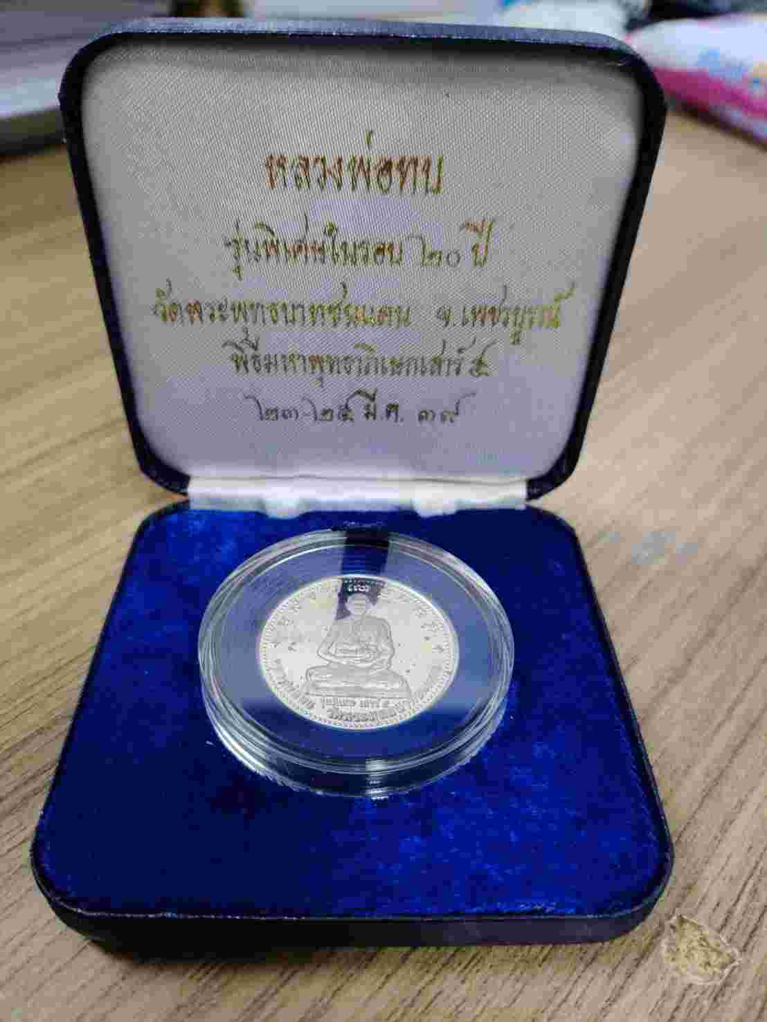 เหรียญหลวงพ่อทบ รุ่นพิเศษในรอบ 20 ปี เนื้อเงินขัดเงา วัดพระพุทธบาทชนแดน จ.เพชรบูรณ์ ปี 2539 (กล่องเดิม) |