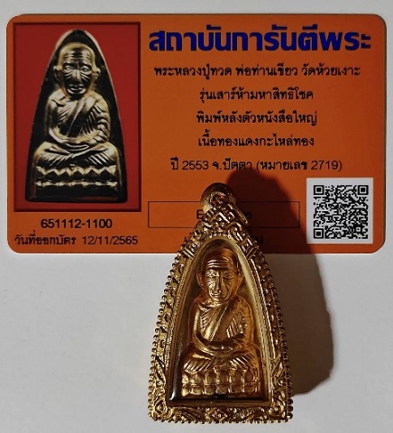 พระหลวงปู่ทวด พ่อท่านเขียว วัดห้วยเงาะ พิมพ์หลังตัวหนังสือใหญ่ รุ่นเสาร์ 5 มหาสิทธิโชค เนื้อทองแดงกะไหล่ทอง ปี 2553 เลี่ยมกรอบทองไมครอน ไม่เคยผ่านการใช้งาน |