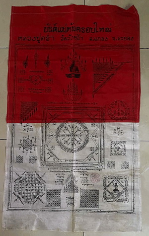 ชื่อพระเครื่อง ผ้ายนต์ พัดโบก ผืนใหญ่ มีปั้มตราวัดยุคแรก ๆ ผ้าตาห่าง