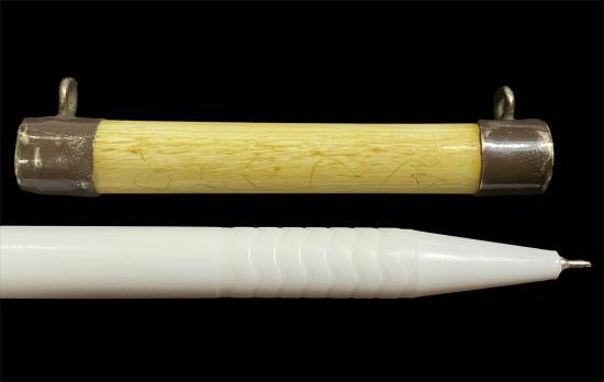 ตะกรุดงา ไม่ทราบที่ จารอักขระ 2 ด้าน เลี่ยมเงินลายงาเก่ามีอายุ ความยาว 2 นิ้ว ขนาดวงใหญ่เท่าปากกาเคมี