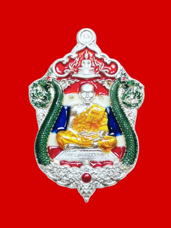 เหรียญเสมาหลวงพ่อพัฒน์ปุญญกาโม หลังท้าวเวสสุวรรณ เนื้อเงินลงยาสีลายธงชาติ ชุดกรรมการ หมายเลขชุด ๖๔ "รุ่น เศรษฐีสมปรารถนา" พิธีพุทธาภิเษก ณ วัดห้วยด้วน จังหวัดนครสวรรค์ เมื่อวันที่ 12 มีนาคมปี 2565