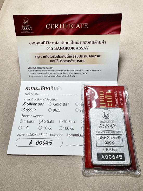 เงินแท่งบริสุทธิ์ 999.9% ( FINE SILVER 999.9% ) BANGKOK ASSAY ขนาด 5 บาท พร้อมใบรับประกัน ( BANGKOK ASSAY แบรนด์ชั้นนำระดับโลก )