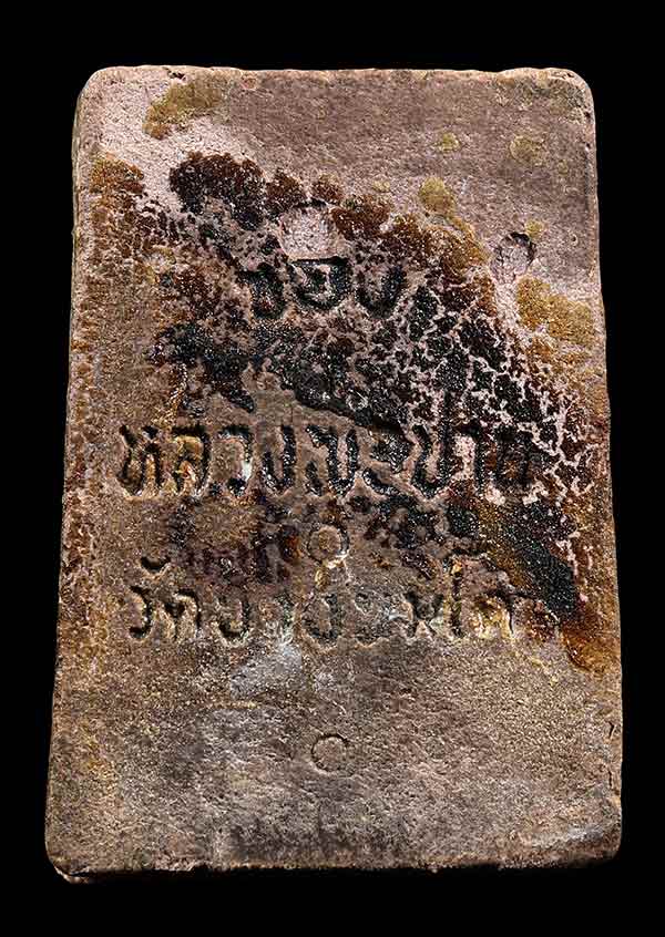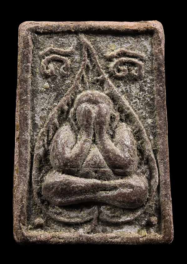 เป็นพระเนื้อผงสีน้ำตาล-เทา ด้านหน้าเป็นรูปพระปิดตา ประทับนั่งอยู่บนรูปใบโพธิ์ ภายใต้กรอบสี่เหลี่ยมผืนผ้า ส่วนด้านหลังจะมีเขียนอยู่ด้วยกัน 2แบบ