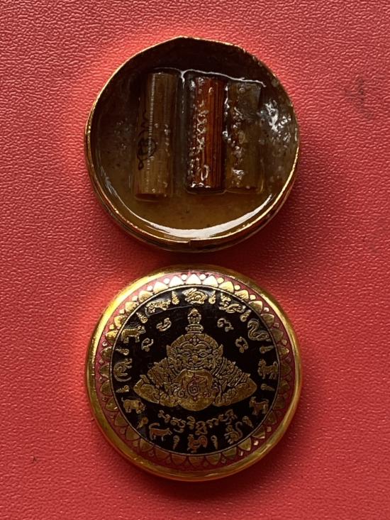 เคาะเดียวแดง สีผึ้งพระราหู รุ่น มงคลจักรวาล เนื้อ โลหะชุบทองลงยาสีดำขอบสีแดง ขนาด 3.2ซม |