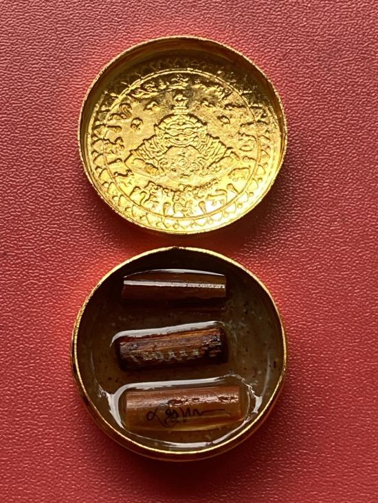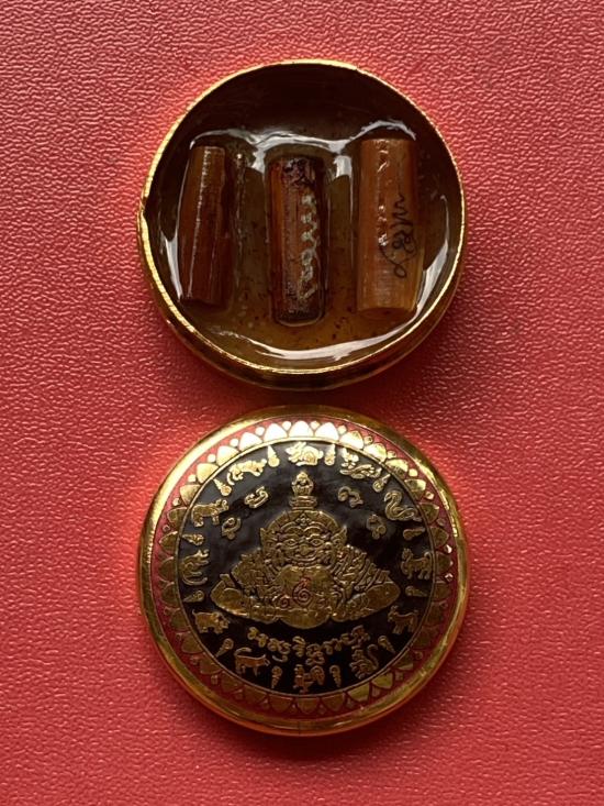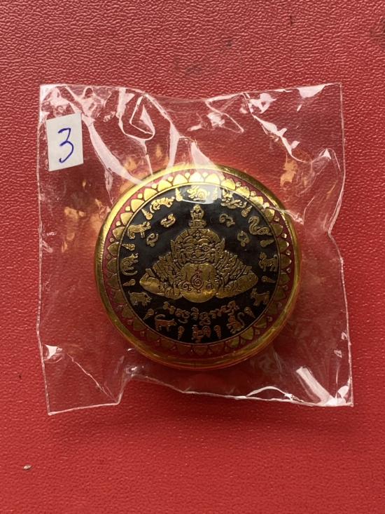 เคาะเดียวแดง สีผึ้งพระราหู รุ่น มงคลจักรวาล เนื้อ โลหะชุบทองลงยาสีดำขอบสีแดง ขนาด 3.2ซม |