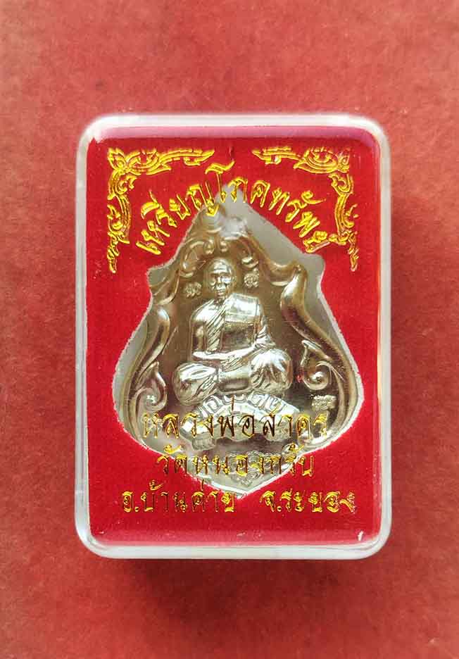 เหรียญโภคทรัพย์(ขี่เต่า) หลวงพ่อสาคร วัดหนองกรับ จ.ระยอง ปี 2552 เนื้ออัลปาก้า no.2334 กล่องเดิม พิธีพุทธาภิเษก ปลุกเสกเดียวนานเกือบ 2 ชั่วโมง ไม่น่าเชื่อ ก็ต้องเชื่อ ขณะเริมพิธีพุทธาภิเษก ฝนตกหนัก พอจบพิธี และดับเทียนชับ ฝนหยุดตก เป็นพระเกจิชื่อดังแห่งเมืองระยอง ศิษย์เอกหลวงปู่ทิม เพื่อศึกษาพระธรรมวินัย และพุทธาคมจากหลวงปู่ทิมวัดละหารไร่อย่างจริงจัง หลังจากนั้นจึงได้รับการถ่ายทอดวิชาอาคมต่างๆ จากหลวงปู่ทิม จนหมดสิ้นโดยมิได้ปิดบังแต่อย่างใด เรียกได้ว่าเรียนได้กระจ่างชัดรู้จริง สามารถปฏิบัติได้เมื่อมีความเชี่ยวชาญในคาถาอาคมต่างๆ ที่เรียนแล้วด้วยใจรักในด้านนี้ ต่อมา จึงได้เสาะแสวงหาศึกษาวิชาอาคมจากหลวงพ่อเพ่ง สาสโน วัดละหารใหญ่ ซึ่งหลวงพ่อเพ่ง เดิมเป็นมหาดเล็กในสมเด็จเตี่ย กรมหลวงชุมพรเขตอุดมศักดิ์ฯ จึงได้ศึกษาอาคมจากหลวงปู่ศุข วัดปากคลองมะขามเฒ่า มีวิชาด้านคงกระพันเป็นเยี่ยมเขียนอักขระลงบนแผ่นตะกั่วเพียงตัวเดียวให้คนทดลองยิงแต่ก็ยิงไม่ออก จนโด่งดังเป็นที่ศรัทธาของลูกศิษย์จนทุกวันนี้ พุทธคุณดีเด่นด้าน เมตตามหานิยม โชคลาภ อุดมทรัพย์ แคล้วคลาดปลอดภัยอันตรายทั้งปวง |