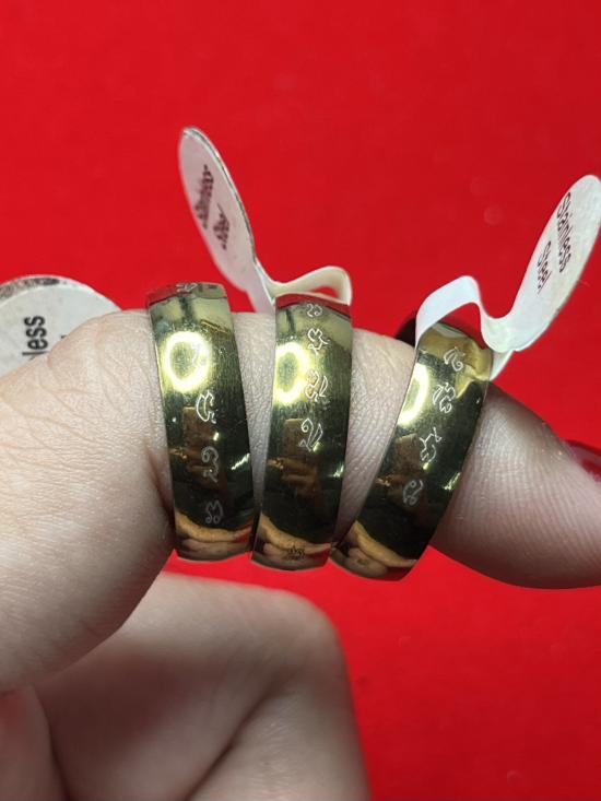 แหวนอลูมินั่มชุบทอง รุ่นเมตตาคุ้มภัย ค้าขายร่ำรวย จารเต็มสูตร รอบวงครับ หลวงพ่อเปิ่น วัดบางพระ นครปฐม 2546 ขนาดแหวน18 มี3วง |
