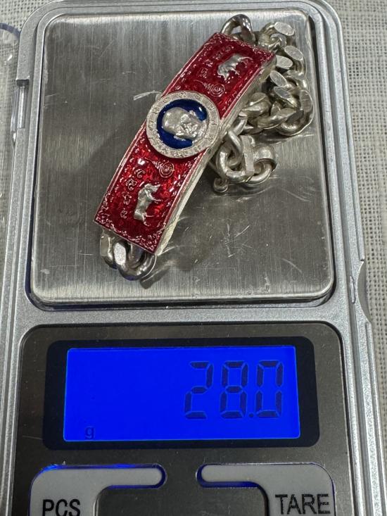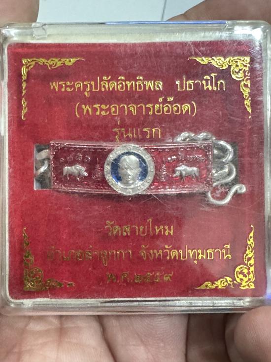 เลสข้อมือ พระอาจารย์อ๊อด รุ่นแรก ปี 2559 เนื้อเงินลงยาสีแดงน้ำหนัก 28 กรัม |