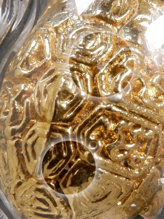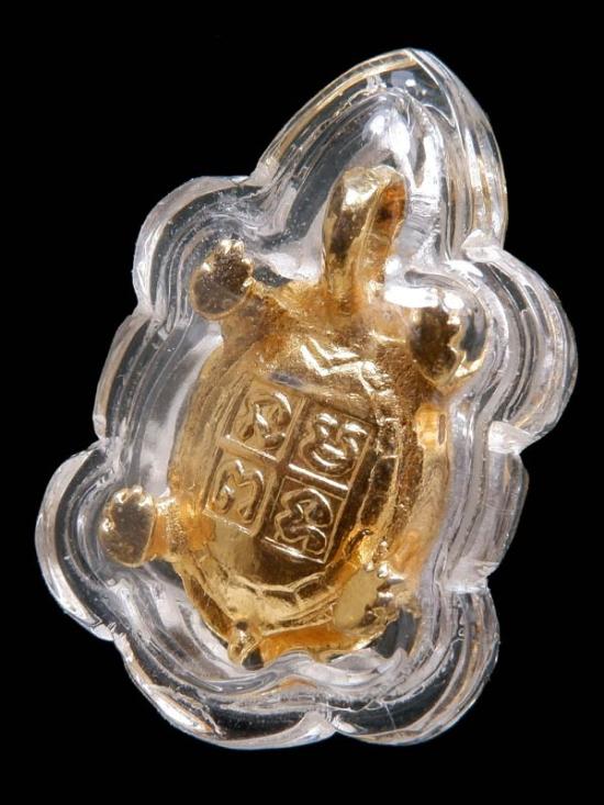 ภายในท้องเต่า ได้ลงแผ่นโลหะจารด้วยเลขยันต์ คาถาอาคม และหัวใจนะต่างๆ ที่ทรงอานุภาพ หล่อหลอมเป็นเม็ดบรรจไว้ในท้องเต่า