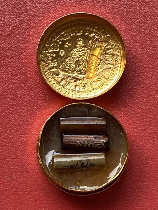 เคาะเดียวแดง สีผึ้งพระราหู รุ่น มงคลจักรวาล เนื้อ โลหะชุบทองลงยาสีดำขอบสีแดง ขนาด 3.2ซม |