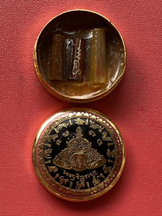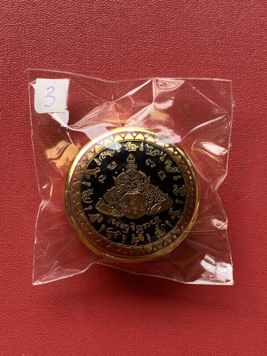 เคาะเดียวแดง สีผึ้งพระราหู รุ่น มงคลจักรวาล เนื้อ โลหะชุบทองลงยาสีดำขอบสีแดง ขนาด 3.2ซม |