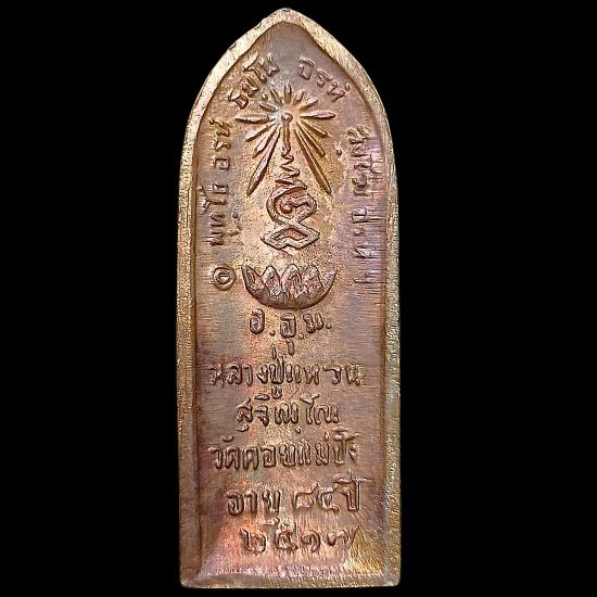รายละเอียด วัดสัมพันธวงศ์ กรุงเทพมหานคร จัดสร้าง คราวทำบุญอายุหลวงปู่ ๘๔ ปี เข้าพิธีในวันงานฉลองอายุเมื่อ ๑๑ มี.ค.๒๕๑๗ เป็นรูปใบข้าว หลวงปู่ห่มคลุมหน้าตรงยืนเต็มองค์ มีลายเม็ดไข่ปลาเป็นซุ้ม ไม่มีห่วง ด้านหลังรูปเฆาะขัดสมาธิ มีรัศมี บัวรองรับ พระคาถา พุทโธ อรหํ ธมฺโม อรหํ สงฺโฆ อรหํฯ อ.อุ.ม. ข้อความ "หลวงปู่แหวน สุจิณฺโน วัดดอยแม่ปั๋ง อายุ ๘๔ ปี ๒๕๑๗" มีโค้ดตอก เหรียญทองแดงรมดำและไม่ได้รม 50,000 เหรียญ, นวโลหะ 108 เหรียญ, เงิน 85 เหรียญ, ทองคำ 17 เหรียญ และที่สำคัญความน่าสนใจของเหรียญนี้มีดังนี้ครับ