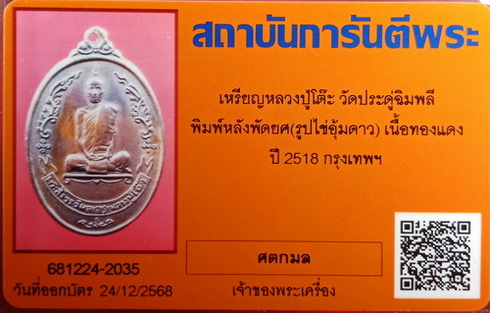 เหรียญรูปไข่หลังพัดยศ หลวงปู่โต๊ะ ปี2518 ( อุ้มดาว จมูกโด่งมาก )