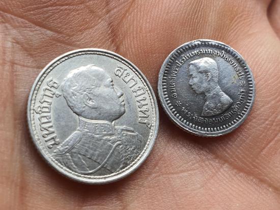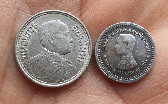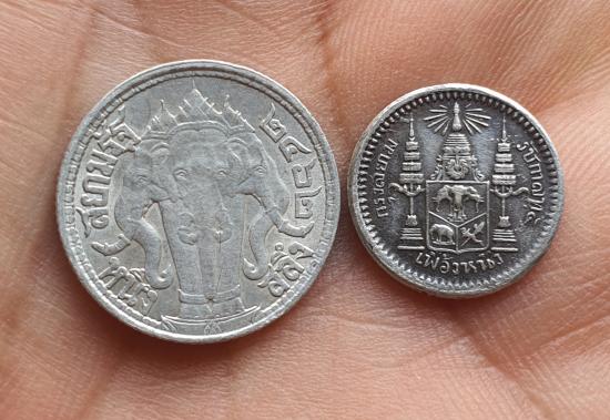 เหรียญกษาปณ์ หลังตราแผ่นดิน (เฟื้องหนึ่ง) พระบาทสมเด็จพระจุลจอมเกล้าเจ้าอยู่หัว (รัชกาลที่ 5เนื้อเงิน)เหรียญหนึ่งสลึงรัชกาลที่6เนื้อเงินปี 2462