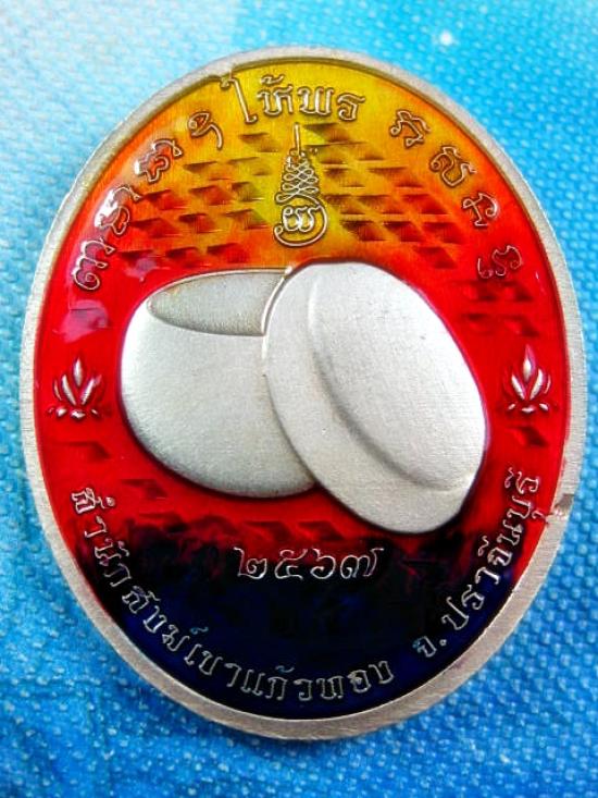เหรียญ รุ่นให้พร เนื้ออัลปาก้าลงยาไล่สีน้ำเงินแดงเหลือง ขอบน้ำเงิน หลังลงยาไล่สี นำเงินเหลือง หน้ากากเงิน ลงยาจีวร (---A60---) |
