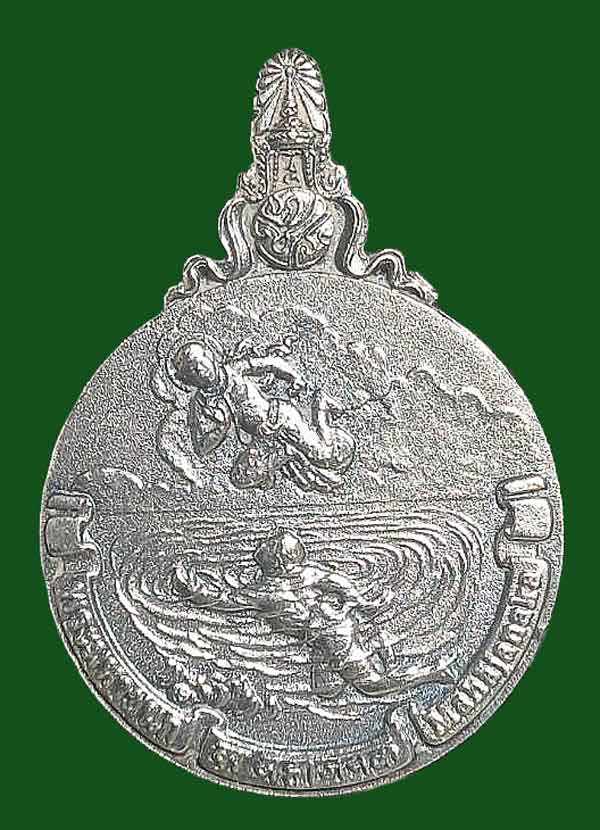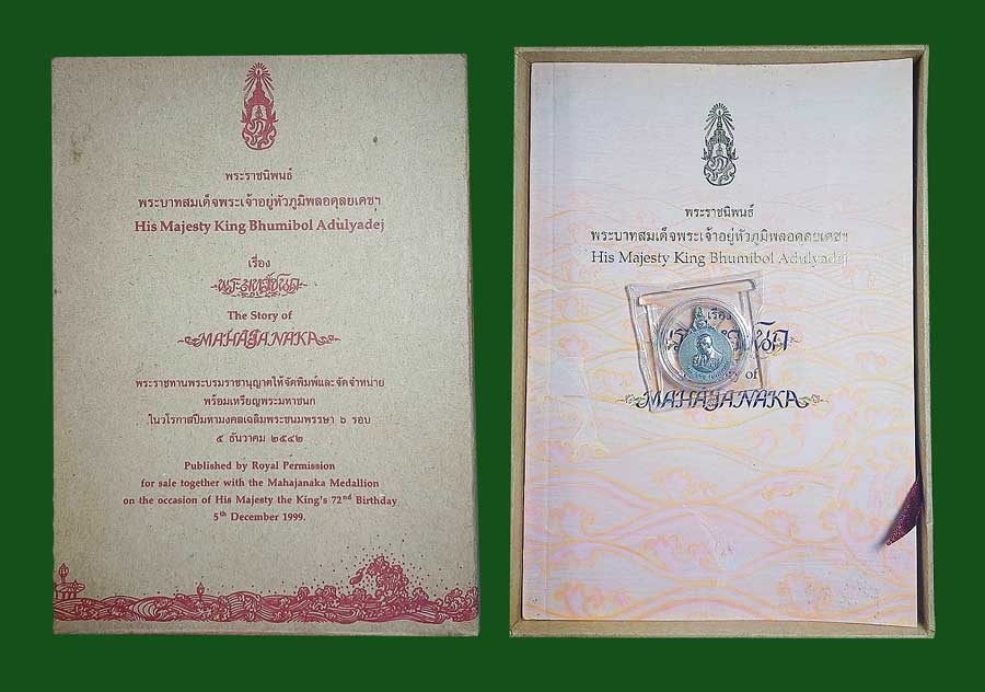 เหรียญพระมหาชนกเนื้อเงิน พิมพ์เล็ก สวยเดิมๆ พ่อหลวง ร.9 ทรงให้อาจารย์เฉลิมชัยออกแบบ เป็นเครื่องระลึกถึง "วิริยะธรรม" คือความเพียร พร้อมชุดหนังสือและกล่องใส่เหรียญครบชุด
