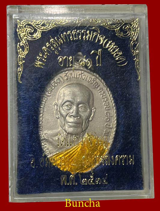 วัดใจ...เหรียญหลวงพ่อหยอด วัดแก้วเจริญ จ.สมุทรสงคราม รุ่นทรัพย์ล้นเหลือ เนื้อเงินลงยาสีเหลือง ปี2534 ตอกโค๊ต หายาก สภาพสวย กล่องกำมะหยี่เดิมๆครับ.