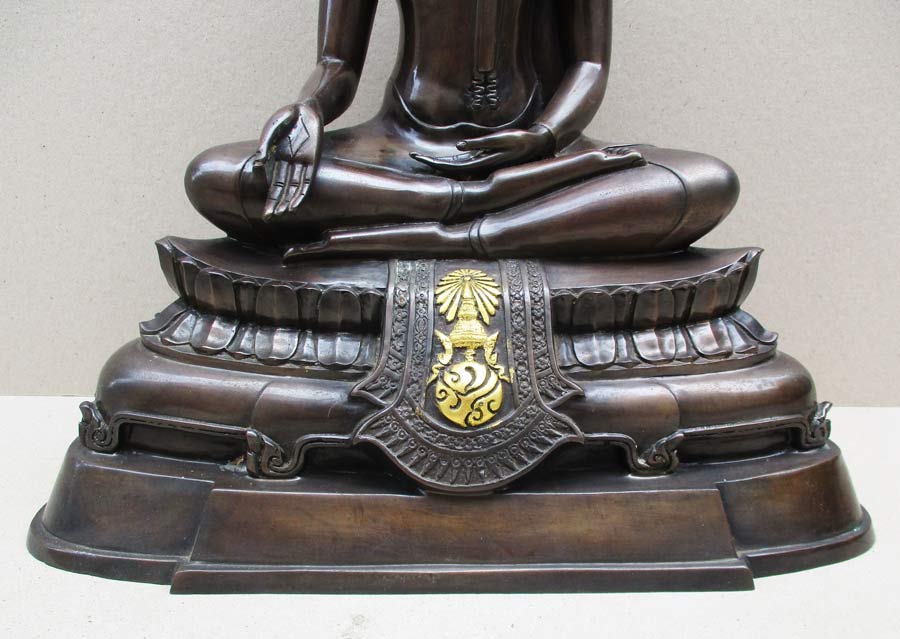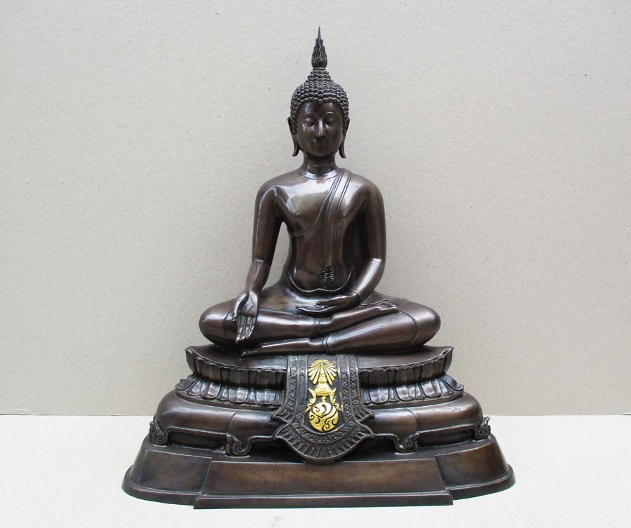 พระพุทธรูปฐานตราสัญลักษณ์ ภปร. ประจำมหาวิทยาลัยนเรศวร จ.พิษณุโลก ในวโรกาสพระบาทสมเด็จพระเจ้าอยู่หัว ภูมิพลอดุลยเดชฯ ครองราชครบ 50 ปี พ.ศ.2539 เนื้อโลหะรมมันปูผิวสวย หน้าตัก 9 นิ้ว ตอกโค๊ต หมายเลข !!