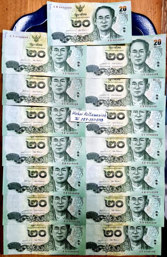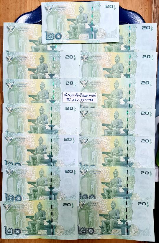 ธนบัตร ร 9 ชนิดราคา 20 บาท แบบ 16 ผ่านใช้ สวยวิ้ง เลข 9หน้า-9หลัง ทุกใบ จำนวน 15 ใบ