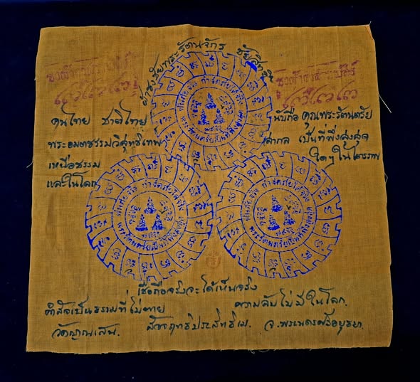 ชื่อพระเครื่อง ผ้ายันต์รัตนจักร หลวงปู่ชื้น วัดญาณเสน ยันต์ 3 ดวง มีจาร ปั๊มตรากำกับ กว้าง 9.5 นิ้ว ยาว 10.5 นิ้ว สร้างน้อย
