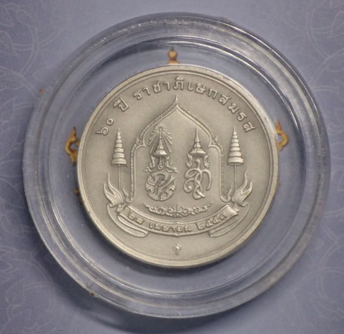 เหรียญที่ระลึก "วาระครบ 60 ปี ราชาภิเษกสมรส เนื้อเงิน" เป็นเหรียญที่ผลิตขึ้นในโอกาสมหามงคลดังกล่าว โดยมีลักษณะเป็น เหรียญเงินรมดำพ่นทรายขนาด 30 มิลลิเมตร น้ำหนักประมาณ 15 กรัม ผลิตไม่เกิน 24,000 เหรียญ