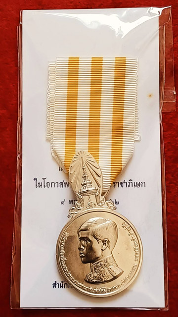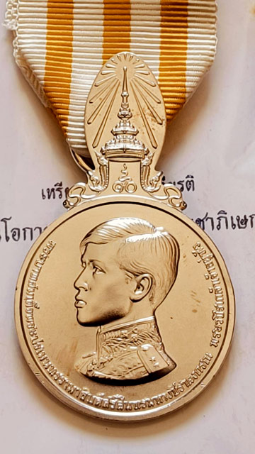 ด้านหน้า พระบรมรูปพระบาทสมเด็จพระปรเมนทรรามาธิบดีศรีสินทรมหาวชิราลงกรณ พระวชิรเกล้าเจ้าอยู่หัว ทรงฉลองพระองค์เครื่องแบบเต็มยศทหารมหาดเล็กรักษาพระองค์ในพระบาทสมเด็จพระปรมินทรมหาจุฬาลงกรณ์ พระจุลจอมเกล้าเจ้าอยู่หัว มีข้อความว่า พระบาทสมเด็จพระปรเมนทรรามาธิบดีศรีสินทรมหาวชิราลงกรณ พระวชิรเกล้าเจ้าอยู่หัว ด้านหน้าขอบเหรียญเบื้องบน มีเลข ๑๐ อุณาโลม ภายใต้พระมหาพิชัยมงกุฎ ใช้ห้อยกับแพรแถบ มีริ้วสีขาวนวลกับริ้วสีเหลืองสลับกัน ริ้วสีขาวนวล