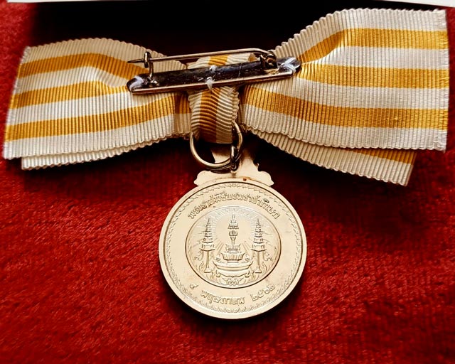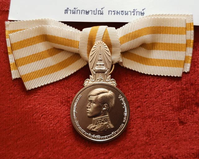 ด้านหน้า พระบรมรูปพระบาทสมเด็จพระปรเมนทรรามาธิบดีศรีสินทรมหาวชิราลงกรณ พระวชิรเกล้าเจ้าอยู่หัว ทรงฉลองพระองค์เครื่องแบบเต็มยศทหารมหาดเล็กรักษาพระองค์ในพระบาทสมเด็จพระปรมินทรมหาจุฬาลงกรณ์ พระจุลจอมเกล้าเจ้าอยู่หัว มีข้อความว่า พระบาทสมเด็จพระปรเมนทรรามาธิบดีศรีสินทรมหาวชิราลงกรณ พระวชิรเกล้าเจ้าอยู่หัว ด้านหน้าขอบเหรียญเบื้องบน มีเลข ๑๐ อุณาโลม ภายใต้พระมหาพิชัยมงกุฎ ใช้ห้อยกับแพรแถบ มีริ้วสีขาวนวลกับริ้วสีเหลืองสลับกัน ริ้วสีขาวนวล