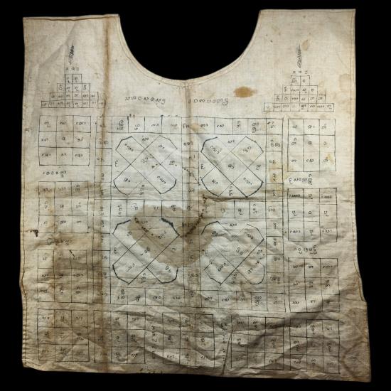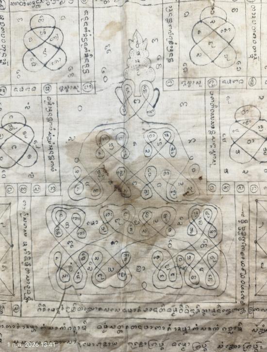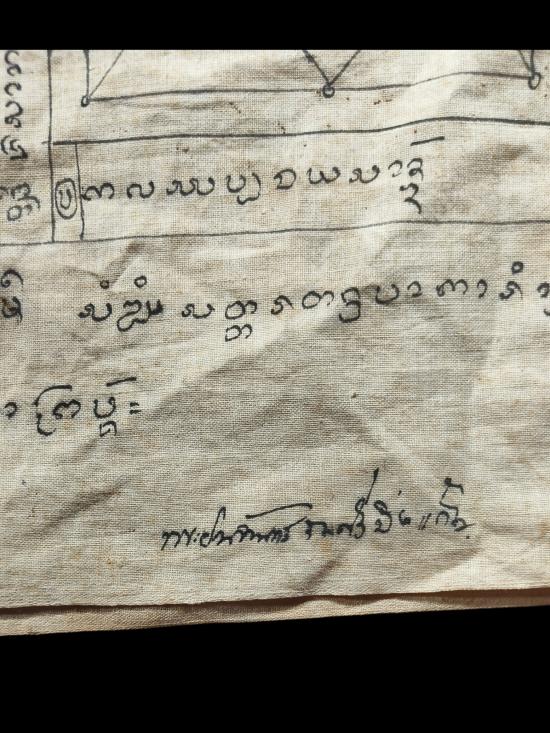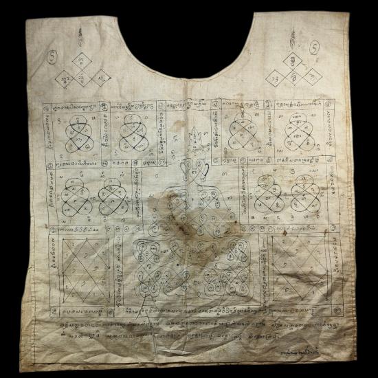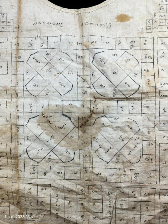 เสื้อยันต์เก่ามีอายุ อักขระล้านนา (มีชื่ออยู่มุมล่างแต่อ่านไม่ออก) สภาพสมบูรณ์วัดใจเคาะแรกแดงครับ