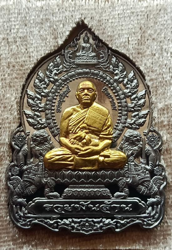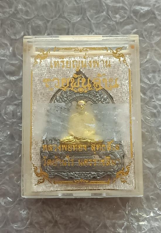 เหรียญนั่งพาน รวยพันล้าน หลวงพ่อทอง วัดบ้านไร่ เนื้อตะกั่วหน้ากากทองทิพย์ หลังเรียบตอก 9 รอบ ฝังตะกรุด โค้ตนำฤกษ์ |