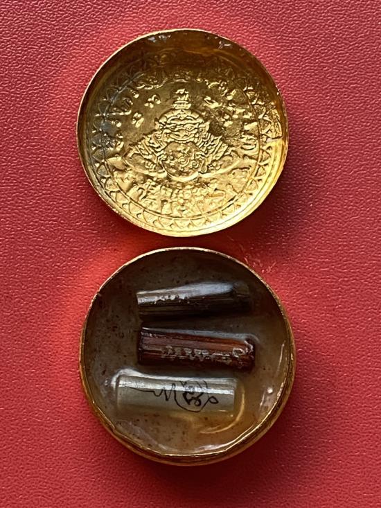 ชื่อพระเครื่อง เคาะเดียวแดง สีผึ้งพระราหู รุ่น มงคลจักรวาล เนื้อ โลหะชุบทองลงยาสีน้ำเงิน ขอบสีแดง ขนาด3.2ซม