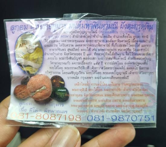 ลูกอม ผงพรายกุมาร มนต์มหาจินดามณี ฝังตะกรุดเงิน หลวงปู่เขียน วัดป่าช้าบ ้านโพนสิม เนื้อผงผสมว่านได้รับความเมตตาจากพระเกจิอาจารย์ ที่เก็บสะสมไว้มอบให้ และจากอาจารย์ชินพร สุขสถิตย์ มอบให้ เช่น ผงพรายกุมาร หลวงปู่ทิม วัดละหารไร่ อ.บ้านค่าย จ.ระยอง ปี ๑๗ ที่หลวงปู่ทิมได้อธิษฐานจิตไว้ก่อนจะละสังขาร, ผงตะไบพระกริ่งชินบัญชร พลอยเสก ผงยาวาสนาจินดามณี ตำรับหลวงปู่บุญ วัดกลางบางแก้ว ผงกระเบื้องเก่า ๑๕๕ ปี จากปล้องไฉน องค์พระปฐมเจดีย์ มอบให้โดยพระธรรมปริยัติเวที เจ้าอาวาสวัดพระปฐมเจดีย์ ผงพุทโธ นิลกาล อธิษฐานธรรมโดยแม่ชีบุญเรือน มอบให้โดย พระเทพปัญญามุนี เจ้าอาวาสวัดอาวุธฯ บางพลัด กรุงเทพฯ ผงเจ้าแม่ตะเคียนทองพันปี เหล็กไหลน้ำ จากแม่น้ำโขง ผงใบลาน ว่านพญาดอกทอง พระธาตุสิวลี มอบให้โดย พระอาจารย์ซิง เจ้าอาวาสวัดไตรมิตร อ.ท่าอุเทน จ.นครพนม ผงตะเคียนตายพราย ผงมะยมตายพราย ผงมะขามตายพราย ผงต้นสักตายพราย ผงมะดันตายพราย ผงมะรุมตายพราย ผงขนุนตายพราย และผงโลกธาตุ หลวงปู่ยิ้ม วัดหนองบัว ต.วังด้ง อ.เมือง จ.กาญจนบุรี และมวลสารต่างๆ