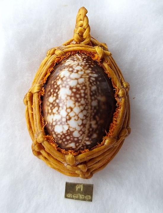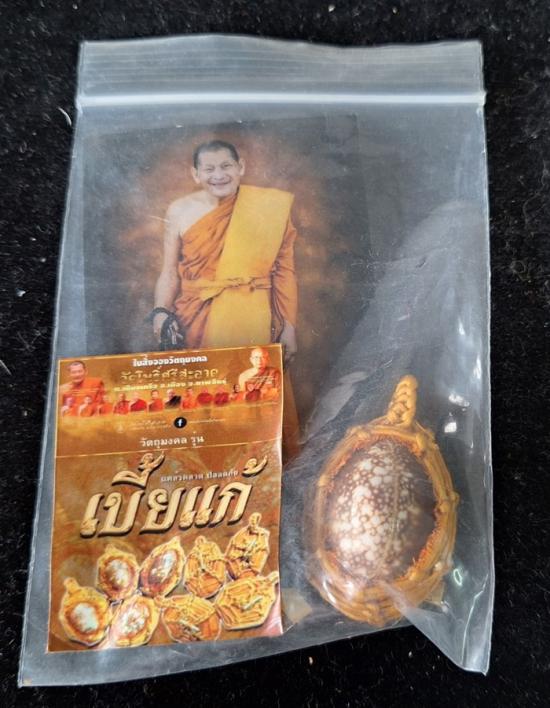 เบี้ยแก้ หุ้มจีวร ถักเชือก หลวงปู่ศิลา วัดโพธิ์ศรีสะอาด มีแผ่นเลขกำกับ ฝังตะกรุดทองเหลือง พร้อมใบคาถา ปี2567 |