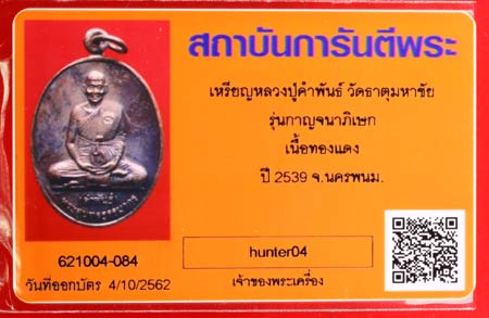 เหรียญหลวงปู่คำพันธ์ วัดพระธาตุมหาชัย รุ่นกาญจนาภิเษก เนื้อทองแดง ปี2539 |