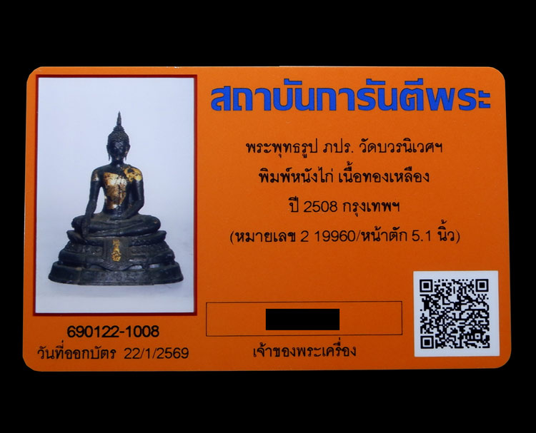 พระบูชา (ภปร.) รุ่นแรกวัดบวร หน้าตัก 5นิ้ว พิมพ์นิยม (บล๊อคหนังไก่) ปี2508 + บัตรรับรอง GPRA (หมายเลของค์พระ 2 19906)