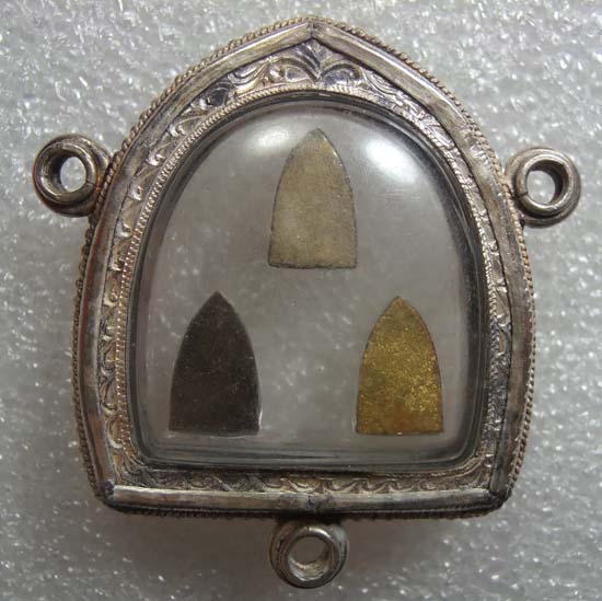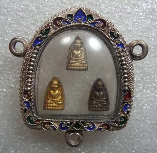 *** วัดใจครับ *** หลวงปู่ทวดพิมพ์เตารีดจิ๋ว ไม่ทราบปี 3 องค์ เลี่ยมกรอบเงินลงยาสุโขทัยสวยๆครับ