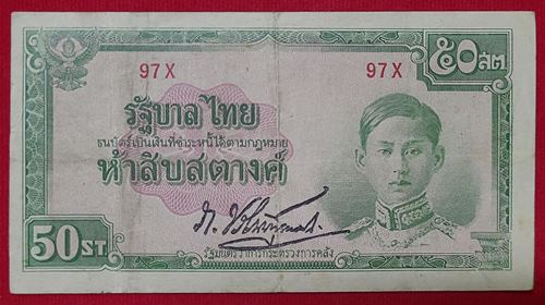 ธนบัตร ของในหลว รัชกาลที่ 8 ชนิดราคา 50 สตางค์ แบบ11 หมายเลข 97X ลายเซ็น ภ.บริภัณฑ์ยุทธกิจ หายากมาก