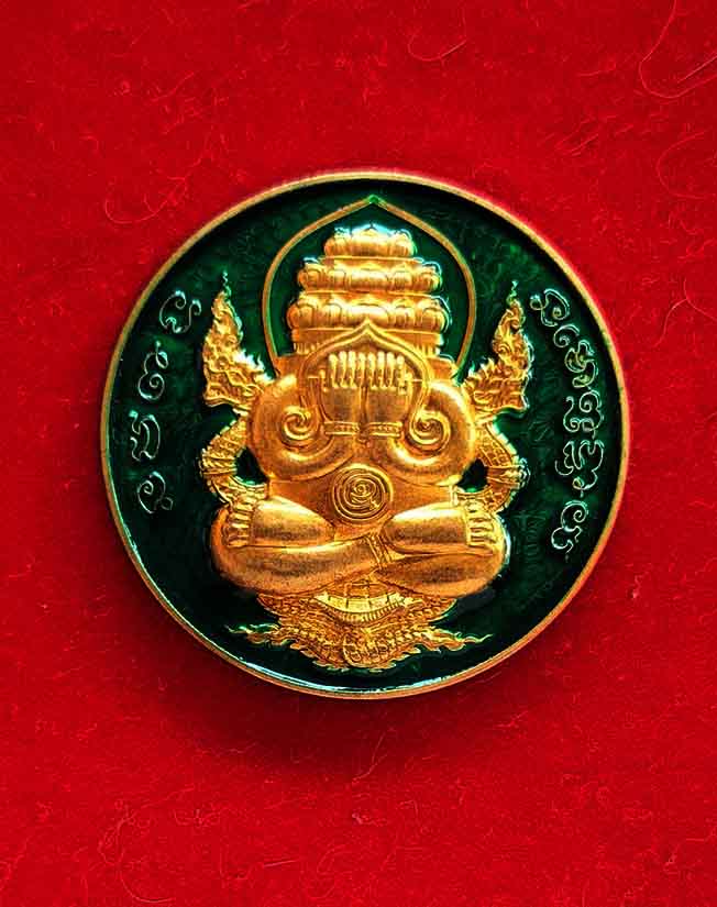 เหรียญพระปิดตาพังพระกาฬ หลวงปู่มหาศิลา สิริจันโท รุ่นรวยโชคอนันต์ เนื้อทองฝาบาตร ลงยาเขียว no.1185 แยกจากชุดกรรมการลงยา กล่องเดิม |