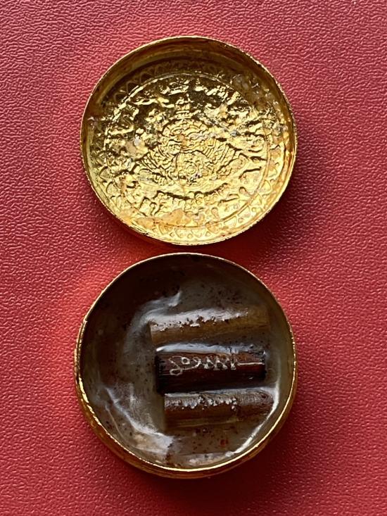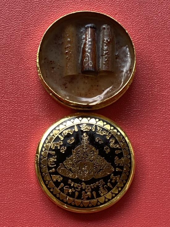 เคาะเดียวแดง สีผึ้งพระราหู รุ่น มงคลจักรวาล เนื้อ โลหะชุบทองลงยาสีดำขอบสีดำ ขนาด 3.2ซม |
