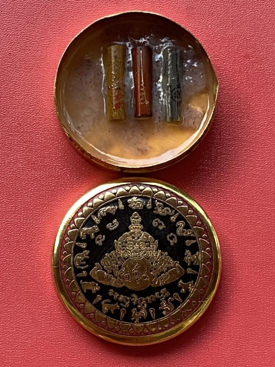 เคาะเดียวแดง สีผึ้งพระราหู รุ่น มงคลจักรวาล เนื้อ โลหะชุบทองลงยาสีดำขอบสีแดง ขนาด 5ซม