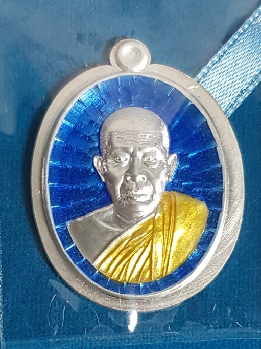 "วัดใจ"เหรียญสมปรารถนา เนื้อเงินไม่ตัดปีกหลังเรียบ+จารมือ ลงยาฟ้าจีวรเหลือง หมายเลข 16 ครูบาแบ่ง วัดบ้านโตนด จ.นครราชสีมา พ.ศ.2556