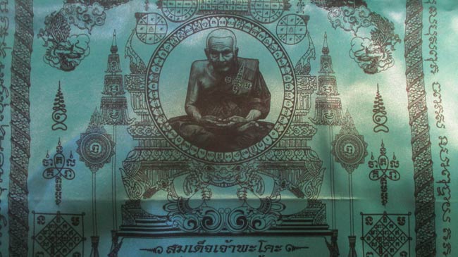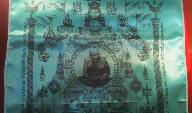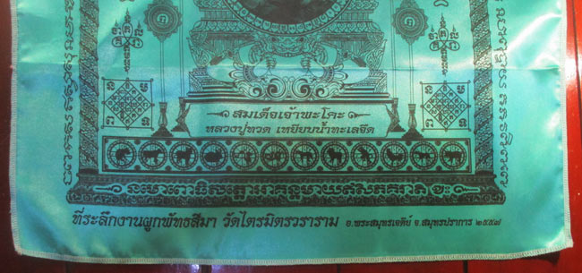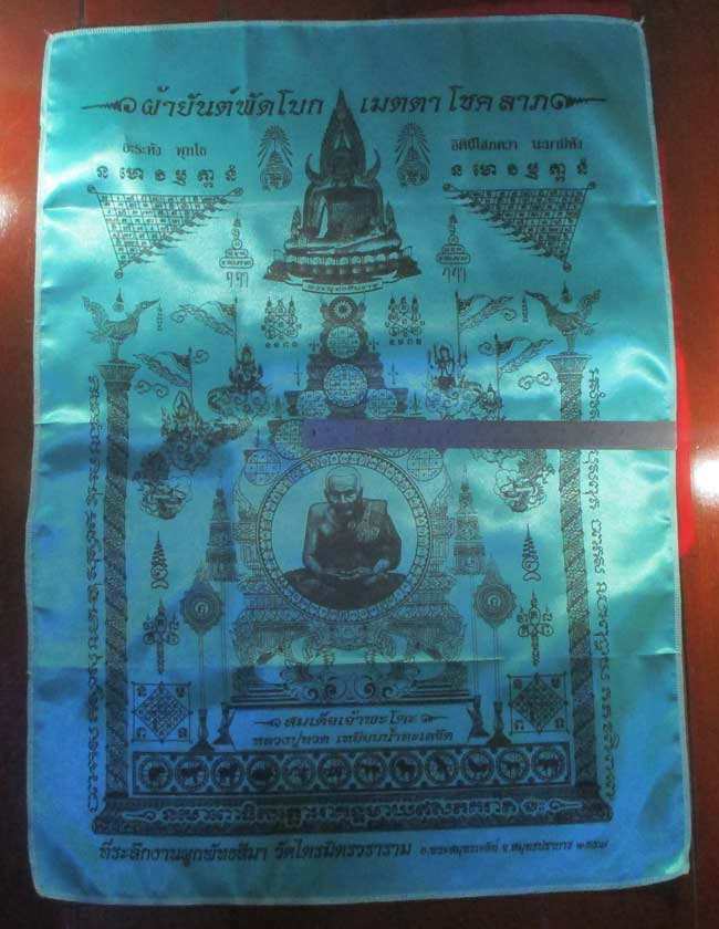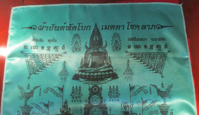 ผ้ายันต์ ที่ระลึกงานผูกพัทสีมา วัดไตรมิตรวราราม อ.พระสมุทรเจดีย์ จ.สมุทรปราการ ๒๕๕๗ ลวดลายสวย ครับ (พระบ้าน ครับ) |