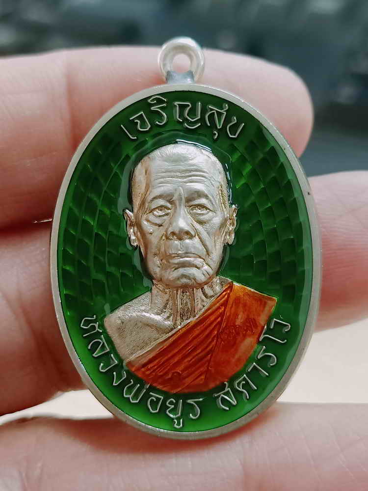 วัดใจ 100 PSGA เหรียญเจริญสุข งานบุญกฐิน หลวงพ่อยูร สคารโว วัดพนมเศษเหนือ จ.นครสวรรค์ ปี 2566 เนื้ออัลปาก้า ขอบเรียบ ห่วงเชื่อมเงิน ลงยาเขียว จีวร หมายเลข 81 กล่องเดิม ***ป๋องสุพรรณการันตี