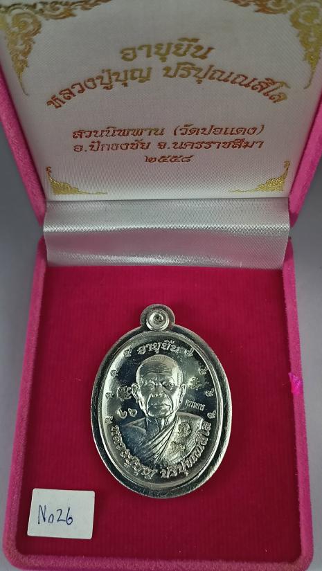 เหรียญอายุยืนบน หลวงปู่บุญ วัดปอแดง ปี58 เนื้อเงิน ไม่ตัดปีก ตอก9รอบ (ตอกกรรมการ/พิเศษ) เบอร์ 26 พร้อมกล่องเดิมครับ (เหรียญหนัก15.34กรัม)