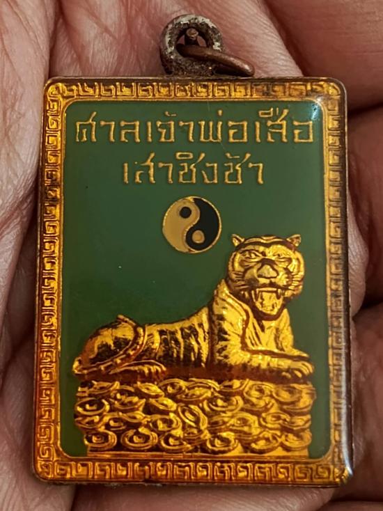 เหรียญ ปีเสือ กะไหล่ทองลงยา เคลือบเรซิ่นใส โชค ดี ม ี สุข หลังยันต์โป๊ยข่วย ศาลเจ้าพ่อเสือ เสาชิงช้า